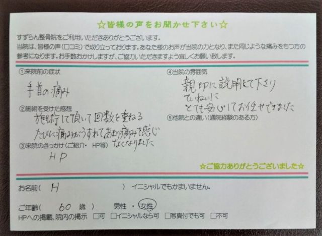 施術して頂いて回数を重ねるたびに痛みがうすれて、あまり痛みを感じなくなりました。