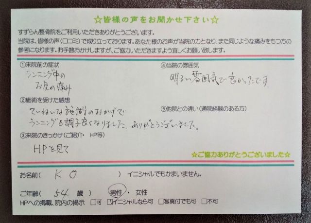 丁寧な施術のおかげでランニングの調子良くなりました。ありがとうございました。