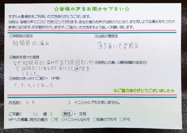 なぜ股関節の痛みが出てるか原因をしっかりと説明してくれるので安心して通院をしました。