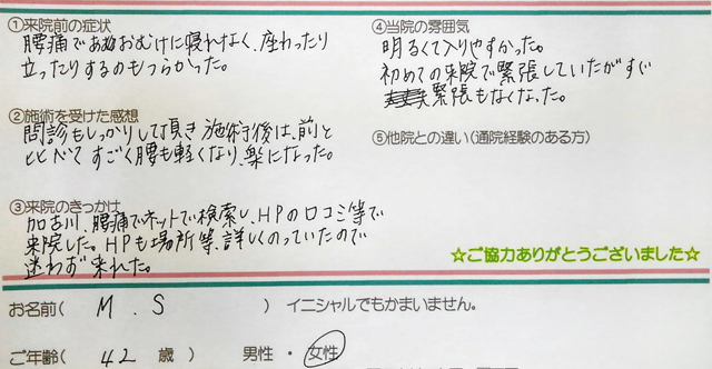 問診もしっかりして頂き、施術後は、前と比べてすごく腰も軽くなり、楽になった。 - 来院のきっかけ