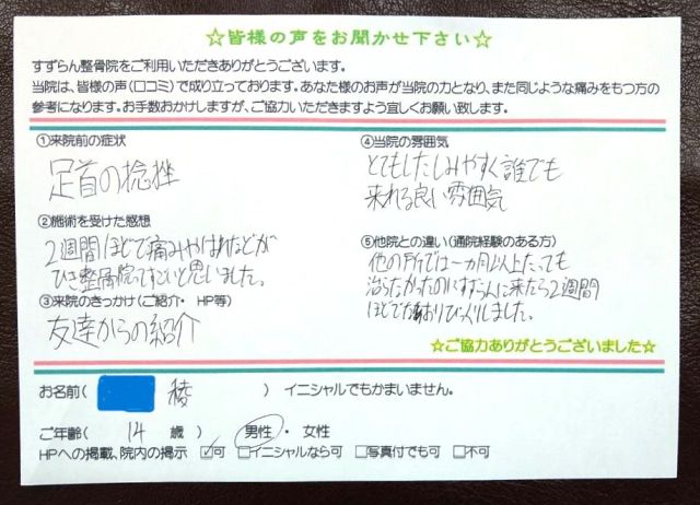 他の所では1ヶ月以上たっても治らなかったのに、すずらんに来たら2週間ほどで治りびっくりしました。