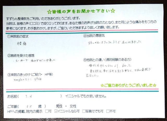 ・薬を飲むことや湿布を貼る事なく、3回の通院で完治した