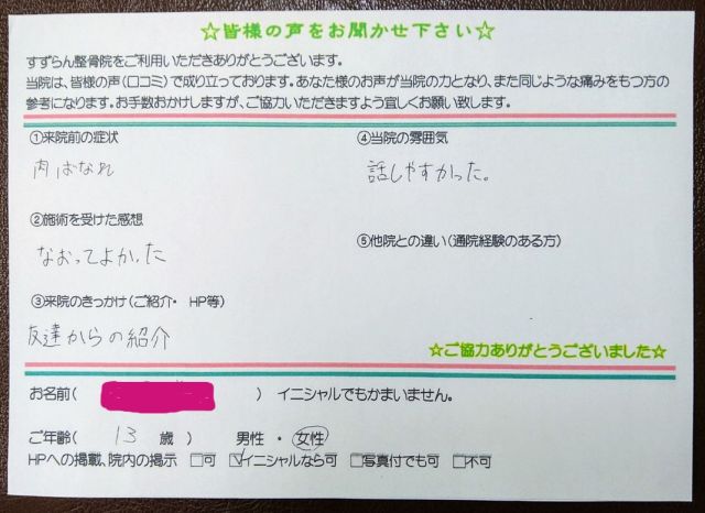 【名前】K・R【年齢】13歳【性別】女性【HPへの掲載】イニシャルなら可