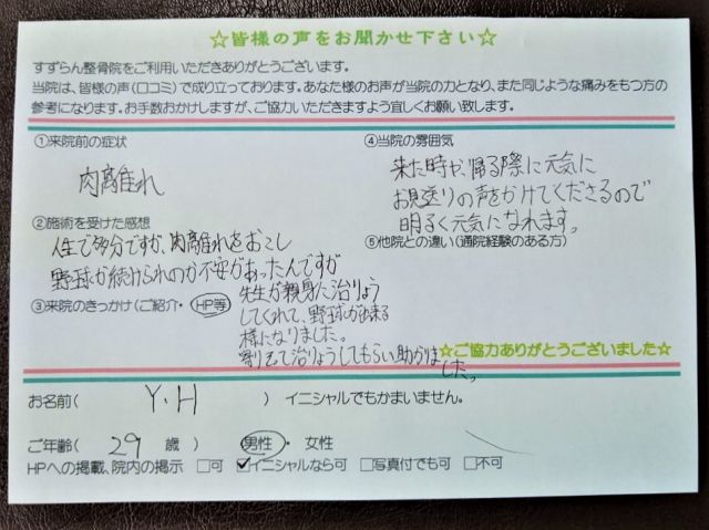 人生で多分ですが、肉離れをおこし野球が続けられるのか不安はあったんですが、先生が親身に治療してくれて、野球が出来る様になりました。寄り添って治療してもらい助かりました。