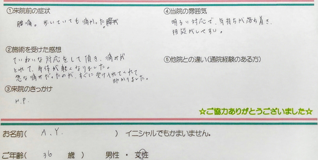 ていねいな対応をして頂き、痛みがとれて、身体がが軽くなりました。急な痛みだったのが、すぐに受け入れてくれて助かりました。 - 来院のきっかけ