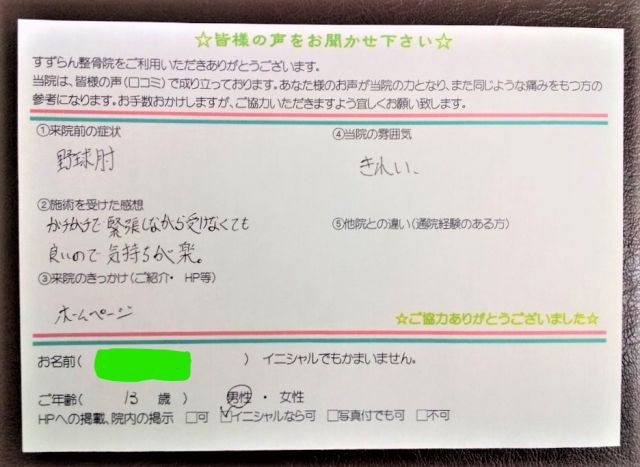 内側野球肘の症状。すずらん整骨院では触診、視診、問診、エコーを用い、どの程度の損傷かをまず判断します。基本はノースローで様子を見ながら、フィジカルをチェックし、怪我した時よりいい状態で復帰できるようアドバイスをしていきます。お子様の怪我の場合、保護者様より質問も多く受けます。大体のことは答えられますので、付き添いで来られた際、疑問があれば何でも気軽に質問ください👍