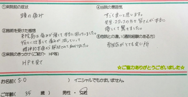来院前は痛みが強くて本当に困っていました。徐々に改善して痛みが減っていって精神的苦痛から解放されて助かりました。 - 来院のきっかけ