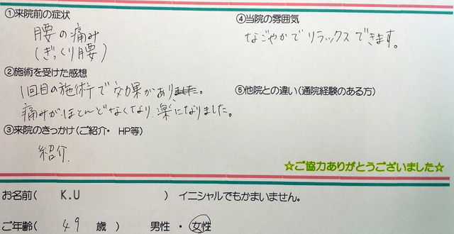腰の痛み(ぎっくり腰)。 - 施術を受けた感想