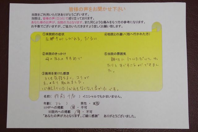 また、日常生活で生じた腰痛や膝痛、肩こりの方も、もちろん来られます。