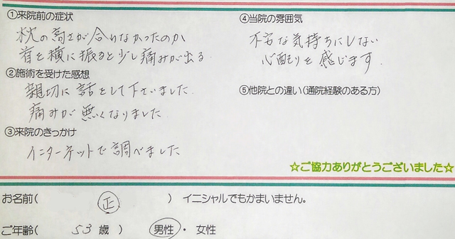 枕の高さが合わなかったのか首を横に振ると少し痛みが出る。 - 施術を受けた感想