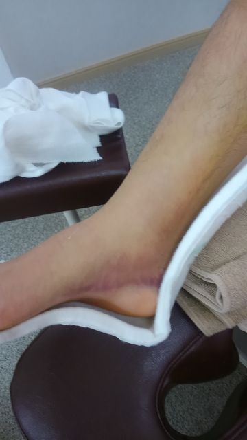下の写真は足首の内果とよばれる部位の骨折、1週間後の写真です。野球のスライディングや、バレー、バスケットの着地時に足首を捻り損傷しやすいところでもあります。