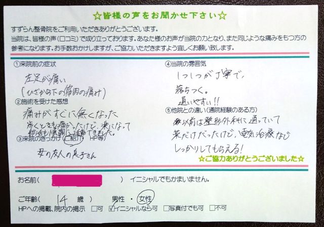 【名前】H・M【年齢】14歳 【性別】女性 【HPへの掲載】イニシャルなら可