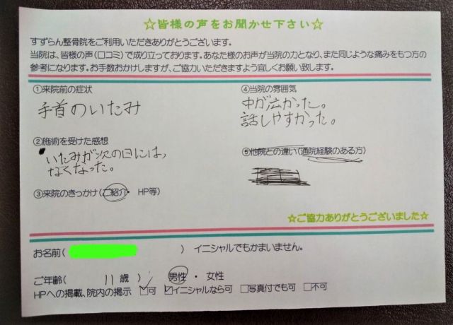手を突いた際に受傷。大人でも転倒時などに発生する手首の痛みです。お子さんの場合は、若木骨折や骨端線損傷といった疾患があり、捻挫との区別がつきにくいことがあります😒すずらん整骨院ではこの判断の際にエコーを用います。触診には自信がある方ですが、画像があると大変便利です👆このお子さんも、捻挫ですみました☯良かったです☺